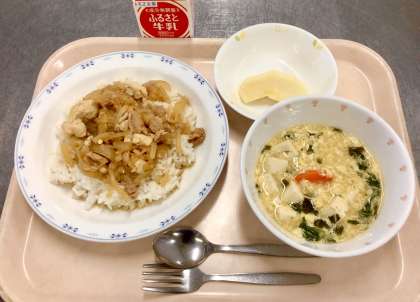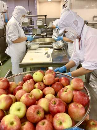 今日のりんごは長野県産のシナノスイートという品種です。酸味が少なく、甘くてジューシーなりんごです。今日のこまつなは東京都八王子産のものを使用しています。