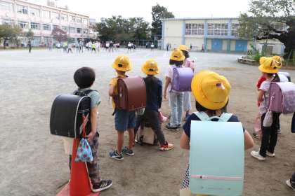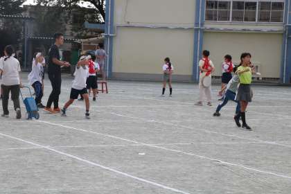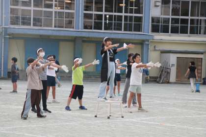 チャイム前に並んでいる子たちも、一緒に応援したり、手の動きをまねっ子したりして興味津々です。