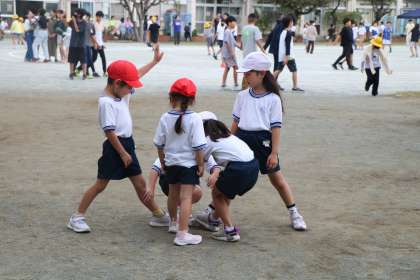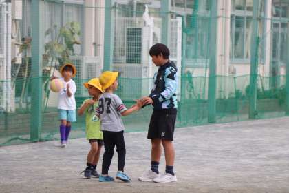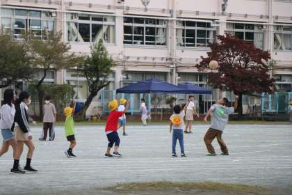 勉強前の朝遊びの様子です。朝からたっぷり体を動かして前頭葉を刺激すると、学習に向かう集中力や理解力がぐんと違います。高学年は優しいしかっこいいです。上下学年関係なく、仲良くかかわりながら遊ぶところが砧っ子の良いところです。