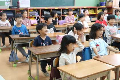 1年生生活科の様子です。9月20日に植えた大根の種が順調に生長しています。これからおいしい大根を収穫するためにどのようなことをしなければならないか、畑の先生をお迎えしてお話を伺いました。