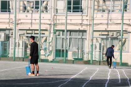早朝から校庭にラインを引いて準備をする先生たちです。先生たちも子どもたちと一緒に熱くなり運動会を盛り上げる意欲いっぱいです。