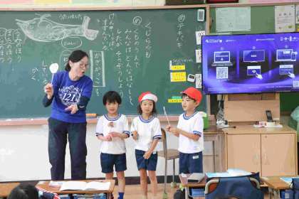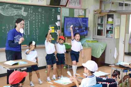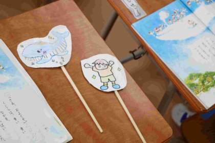 すてきな絵を描いて割りばしに貼った道具を持っただけでウキウキの一年生が、たくさん発表しました。