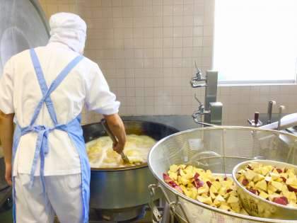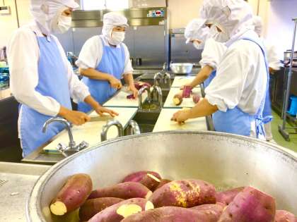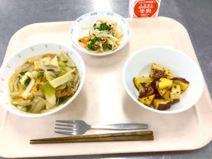 使用したちゃんぽん麺は国産小麦からつくられています。長崎ちゃんぽんは太い麺と具材の多さが特徴です。今日の給食のちゃんぽんにも、豚肉、いか、かまぼこ、にんじん、白菜、ねぎ、もやし、青梗菜とたくさんの具材が入っています。うまみたっぷりの麺料理です。今が旬のさつまいもを使って大学芋を作りました。砧小全校全員分の大学芋をつくるために使用したさつまいもは全部で225本でした。