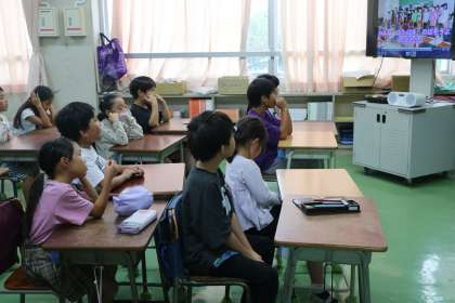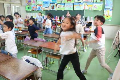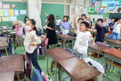 2年生は教室でも運動会モードです。音楽の授業の最後に、閉会式でも歌いますね〜校歌の練習。そしてエビカニクスの歌で盛り上がりました。