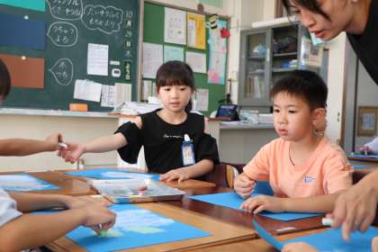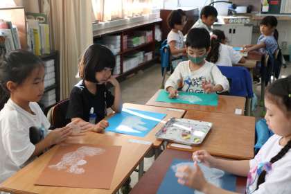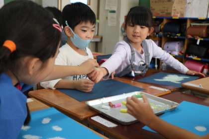 1年生図工の様子です。今日は次の作品に取り組むための下書きです。色画用紙を何に見立てるのでしょう?画材のチョークで描いた感じを楽しみながら作品に取り組んでいます。