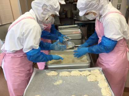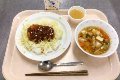 明日の運動会に合わせて給食では「運動会応援献立」の「みそ勝丼」です。
