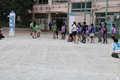 審判係は、かけっこでゴールに走りこんできた子たちをいかに正確に、いかに早く等賞旗へ連れていくかを何度も練習しています。