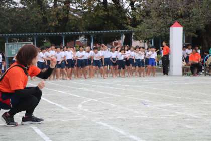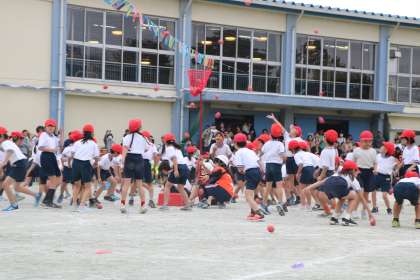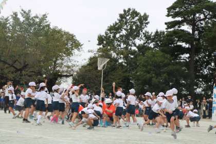入場問で次の出番を待つ6年生が一緒にエビカニクスを踊りながら応援している姿がなんともかわいいです。