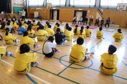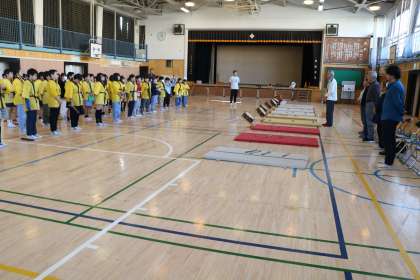 今日もご指導にいらしてくださった石井戸囃子保存会の方を前に、元気に挨拶して始まります。