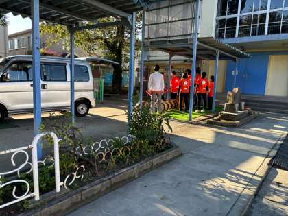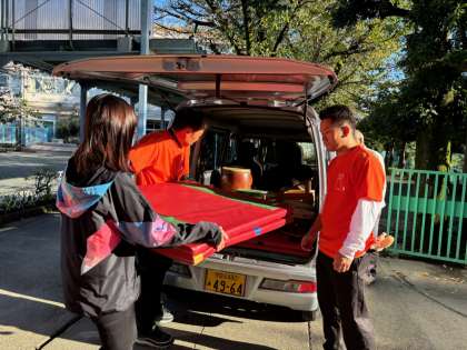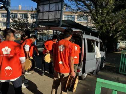 体育館で、4年生が石井戸囃子の発表をさせていただきます。早朝、石井戸囃子保存会の方々が学校に準備のため来てくださいました。学校では4年生以外の先生たちも手伝いに来ています。