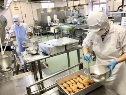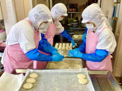 コロッケはじゃがいもから手作りしています。今日のコロッケはおからと豆乳が入ったおからコロッケです。じゃがいも、たまねぎ、豚挽き肉のいつもの具におからを足しているので、味はいつものポテトコロッケとほぼ変わりなく、カリカリほくほくのコロッケです。