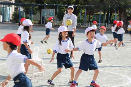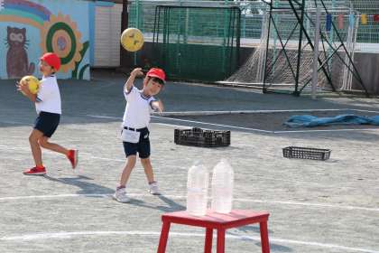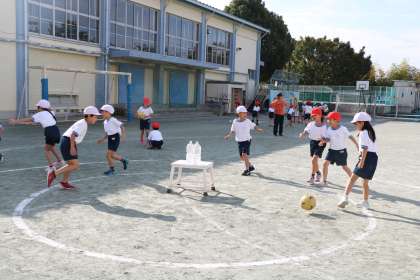 円の真ん中に置いてあるペットボトルにボールが当たったら点数になります。子どもたちと一緒にルールを決めながら取り組みます。