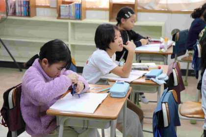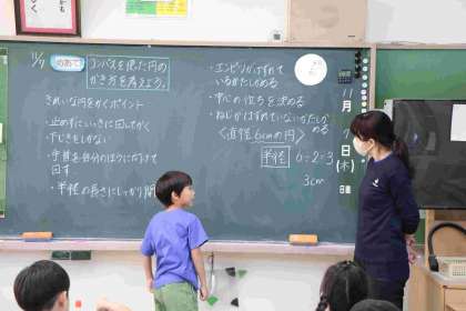 かく時に気を付けることや、直径÷2をして半径を求めてからコンパスを使うことなど、丁寧に話し合いながら理解を深めていました。いざ、円をかく時は真剣!