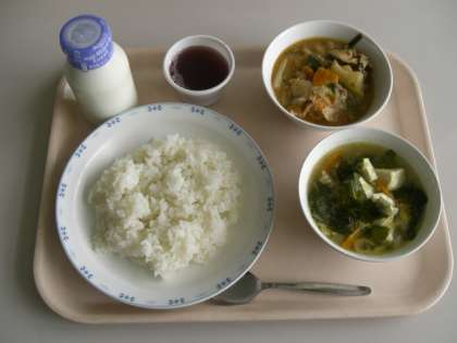 スタミナ丼 わかめスープ ぶどうゼリー 牛乳