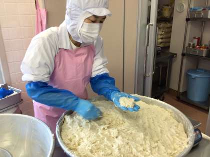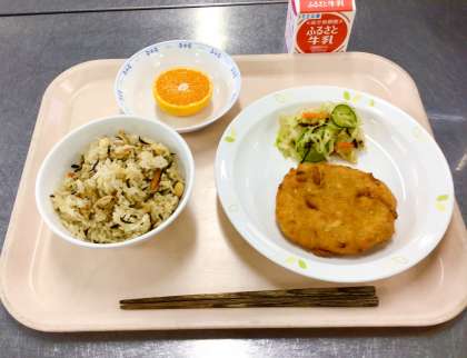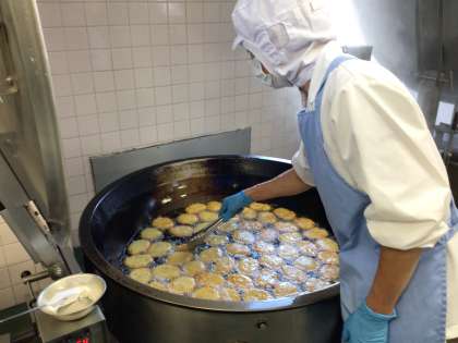 給食室でさつまあげを手作りしました。材料はたら、いか、とうふ、ごぼう、たまねぎ、パン粉です。手作りさつま揚げは外はカリッと、中はふわっとしていて、とてもおいしくできました。写真はさつま揚げの材料を練っている様子と、油で揚げている様子です。