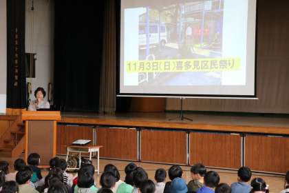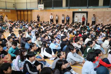 夜中からの雨が少し残る月曜日の朝です。全校朝会は体育館で行いました。運動会の代休、振替休日などで、全校で集まったのは久しぶりでした。運動会でみんな心を一つに頑張ったこと、石井戸囃子の発表をがんばった4年生のこと、社会科見学でマナーを守り学習を頑張った5年生のことなど・・・どんな時も「真剣に全力で」頑張る砧っ子の話をしました。