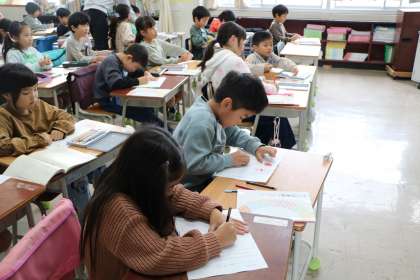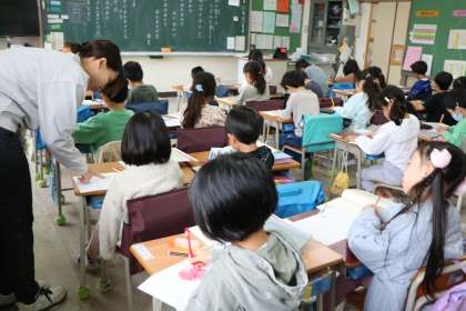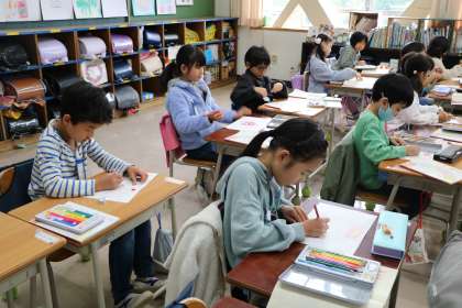 1年生日本語の様子です。鎌倉時代のお坊さんが詠んだ「あかあかや」という「あか」がたくさん出てくる歌です。みんなで朗誦してリズムを楽しんだり情景を想像して絵をかいたりします。