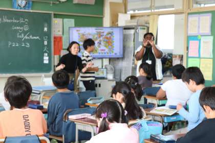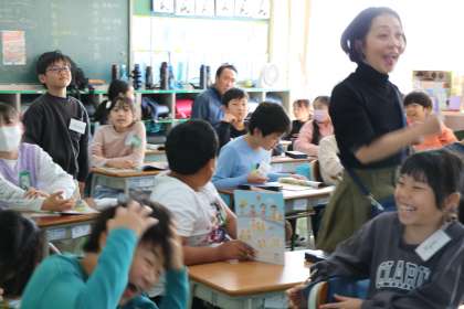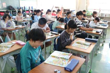 見開きの地図を見ながら何がどこにあるかを見つけ、さまざまなwordsに触れます。繰り返し発音することで、より外国語に親しみ、恥ずかしいとか間違えてるかもしれないから言えない・・ということがないよう、慣れ親しむことが大切です。子どもたちは先生の明るい雰囲気に、とっても楽しそうです。