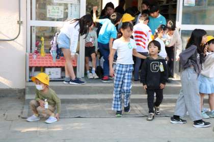 4年生が1年生をエスコートして班の場所に集まります。
