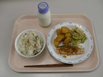 「食育の日」豆ごはん 魚の南蛮焼き じゃがいもの甘辛煮 ごま酢かけ 牛乳