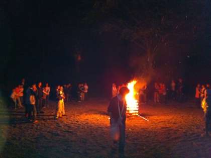 キャンプファイヤーです。炎を囲んで、歌やゲーム、フォークダンスなどを楽しみました。