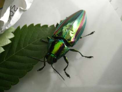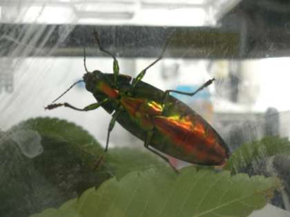 主事さんが、朝 きれいな虫がいたと、持ってきてくれました。それは、大変珍しい玉虫でした。羽が大変きれいで、子どもたちも感激していました。法隆寺の玉虫厨子を思い出しました。