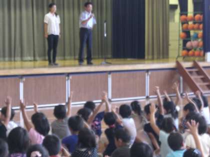 いよいよ2学期が始まりました。目標をもって取り組む大切さを話しました。5年生の児童が2学期の目標を、はっきりと力強く話しました。この夏、トライアスロンに挑戦した徳永先生の話も聞きました。