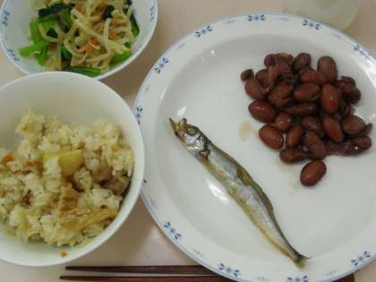 10月19日(金)秋の香りごはん 焼きししゃも おひたし 煮豆 牛乳