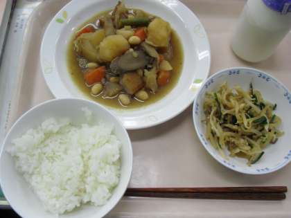 10月30日(火)今日の給食 ご飯 豆入り筑前煮 もやしの胡麻風味 牛乳