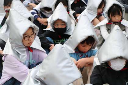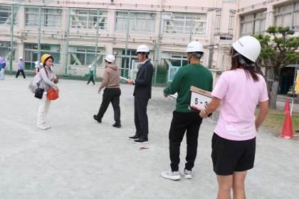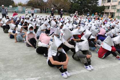 先生たちが避難終了後人数点検をして報告をしている間も、とても静かに整列している子どもたちです。全体の真ん中に座っていた幼稚園の子たちも周りをよく見て、静かに待つことができました。砧幼稚園の子も立派な砧っ子です。