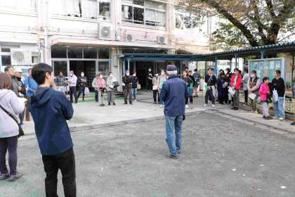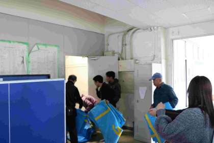 本部長の挨拶で始まり、防災倉庫から物品・物資を運び出して準備開始です。