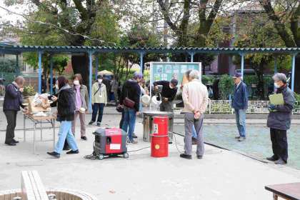 発電機・バーナーの取り扱いを訓練し、炊き出しを行いました。ここでも、卒業生がひと作業、体験中です。