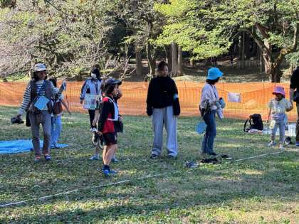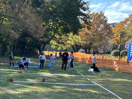 大蔵運動公園をスタートし9つのポイントでゲームを楽しみながらゴールを目指します。写真はスリッパ飛ばしと万歩計レースの様子です。万歩計を足首につけて20秒間で何回になるか測ります。必死で足踏みをしながらグループごとに挑戦です。20秒間で60回!「すごいね〜」と感心していたらなんと「109回!」という子もいました。