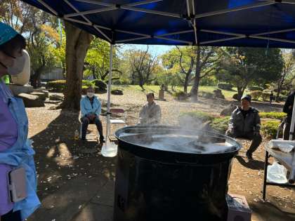 ゴールでは、大きな鍋で豚汁を煮込んで帰ってくる子どもたちを待っています。