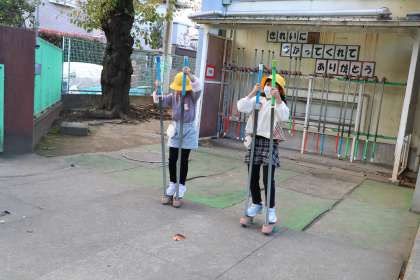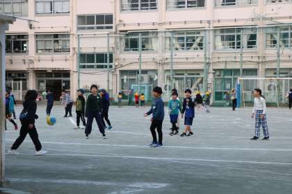 8時5分を過ぎました。朝遊びの様子です。砧小学校では、登校し朝の支度を終えたら外で楽しく遊ぶことを推奨しています。朝から体を動かし、好きな遊びをワクワクしながらすることは前頭葉の働きを活発異にしてその後の学習に集中できるという考えからです。