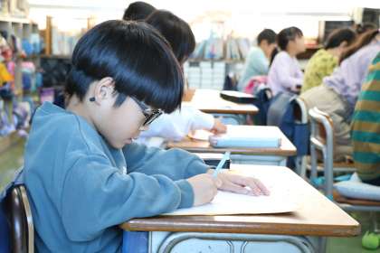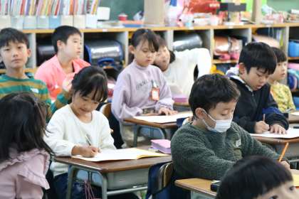 2年生国語「紙コップ花火の作り方」の学習の様子です。おもちゃ作りの説明文を読み、その説明の工夫を生かして書くという、「読むこと」「書くこと」を両方学習するところです。子どもたちは、おもちゃを作る手順を分かりやすく説明するための工夫を読み取ろうと頑張っています。