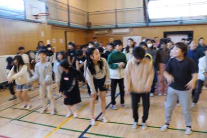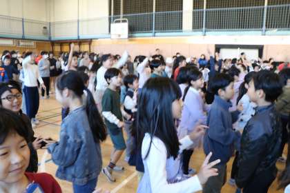 最後の「エビカニクス」ではみんなで曲に合わせて体を動かし、楽しい集会が終わりになりました。2年生はもちろん5年生6年生のお兄さんお姉さんもみんなで楽しめました。