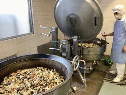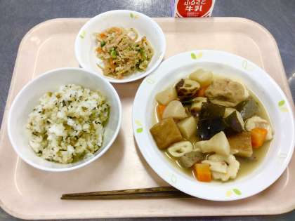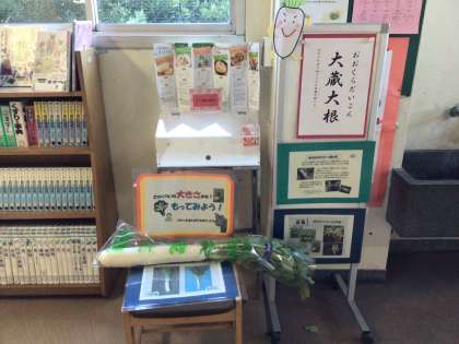 今日の給食はせたがや育ちの大蔵大根をつかった「せたがや育ち給食」です。給食のサンプルの前に大蔵大根の展示したところ、こどもたちはずっしりと大きくりっぱな大蔵大根に驚いていました。大蔵大根は青首大根に比べて水分が少なく、荷崩れしにくいので、おでんや煮物にすると味がよくしみ、おいしくなります。今日は大蔵大根を使っておでんを作りました。給食室の大きな釜2つ分!かつおぶしと昆布のだしがしみ込んだおいしいおでんができました。