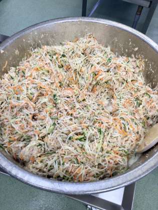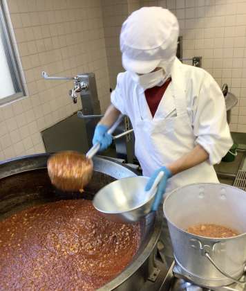 チリビーンズはアメリカの代表的な料理です。給食では大豆を使って作っています。大豆を使った料理では、こどもたちに一番人気がある献立です。大豆は畑の肉と呼ばれるように、体をつくるたんぱく質が豊富な食品です。