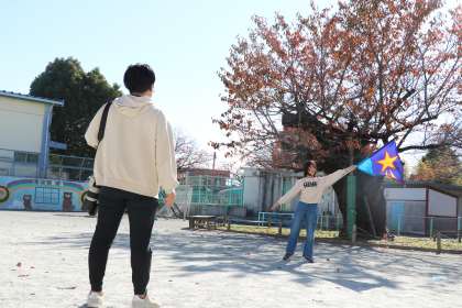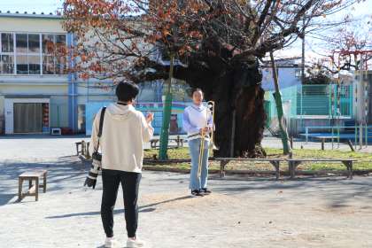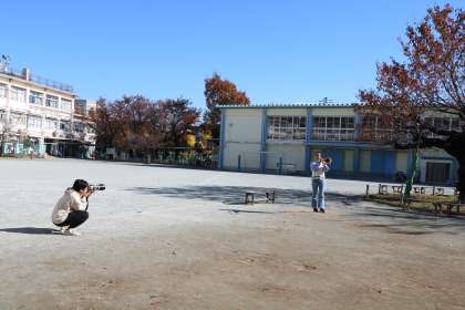 6年生は卒業アルバムの個人写真の撮影でした。砧小学校の卒業アルバムの写真は、それぞれが考えた思い出の場所で、思い出の小道具と写真を撮ります。校庭での写真を希望した子たちが撮影してもらっている様子です。