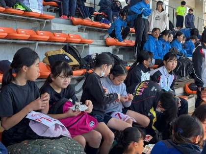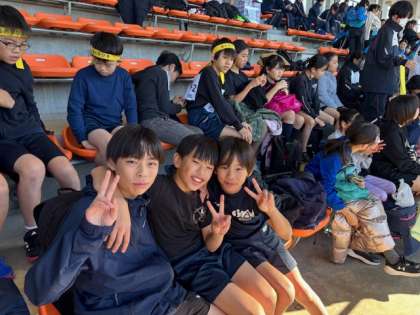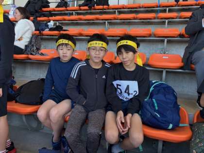 ウォーミングアップの後はゼッケンをつけて、体を冷やさないように待機です。ままなく呼び出し時間なので、少しドキドキで座っている小学生。でも仲間と互いに身支度をチェックしたり、中学生が声をかけてくれたりしてリラックスできます。