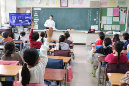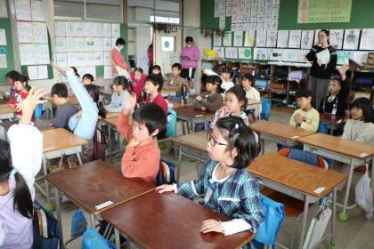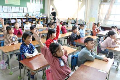 1年生道徳の様子です。今日は「ともだちのことをかんがえて」というテーマで、「2羽のことり」というお話を読んで考えました。担任の先生が勉強のために声をかけたので、校内の多くの先生たちが授業を見に来ています。放課後、授業について先生たちの勉強会があります。砧小学校の先生たちは互いに学びあって授業力を高めようと一生懸命です。