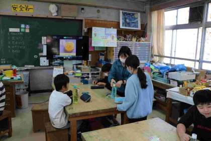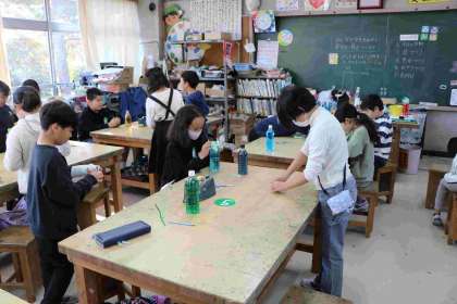 4年生の図工の様子です。展覧会に向けて共同作品を作りました。