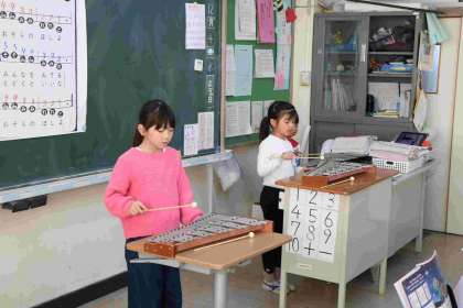 「きらきらぼし」の鍵盤ハーモニカに合わせて、順番に鉄琴を体験しました。楽器の種類が増えると演奏もより楽しく本格的になりますね。