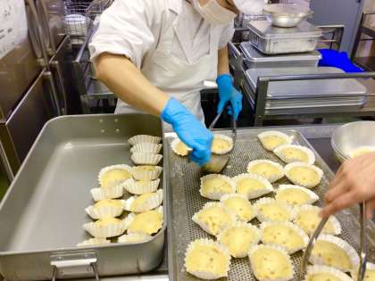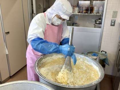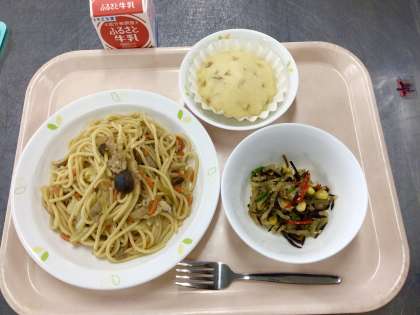 今日の蒸しパンは生のりんごを小さく切って、さとうとレモン汁、白ワインで煮て作りました。りんごの香りがおいしい手作り蒸しパンです。大根とひじきのサラダは人気があるサラダのひとつです。