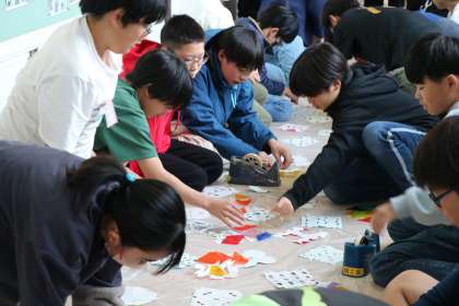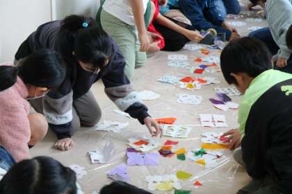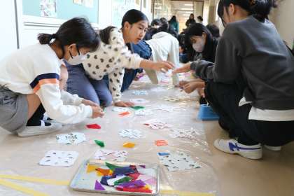 その後は、全学年で取り組んでいる共同作品の仕上げです。さすが6年生!色の配分や全体をみたバランスなどを相談しながら創り上げています。