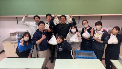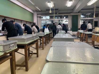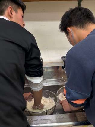 家庭科室で先生たちが全クラス分の持ち米を洗い水につけます。