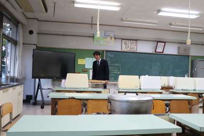 朝6時過ぎに学校中の窓を開けたり校舎内点検をした後、家庭科室でお湯を沸かし始めたのは、副校長先生です。