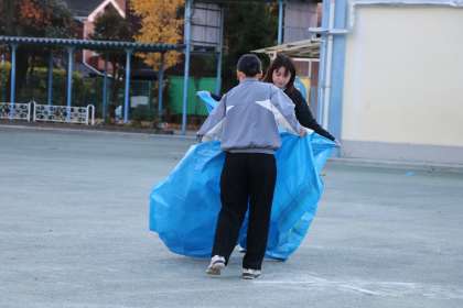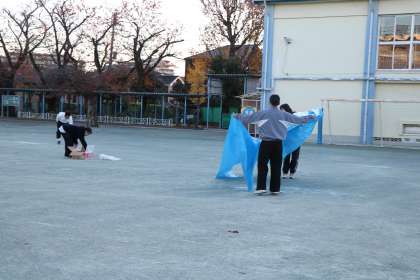 7時過ぎると先生たちも校庭に出て臼を置くブルーシートを敷き始めます。