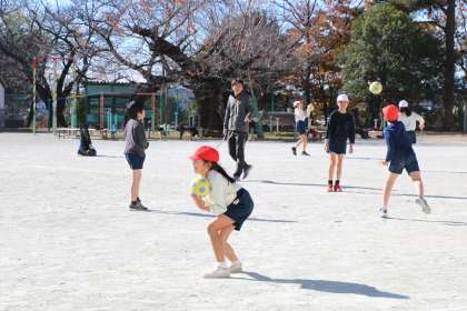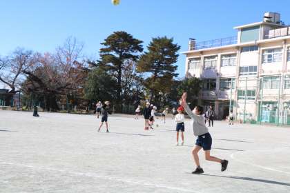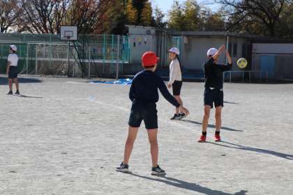 5年生体育・ハンドボールの様子です。前回の試合内容をもとに、チームごと作戦を立て工夫した練習をしています。